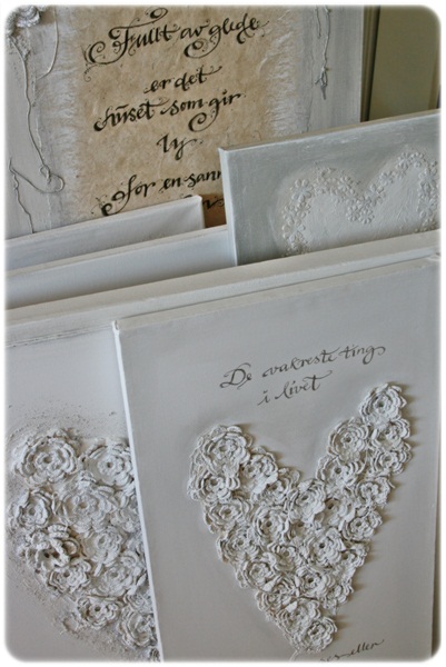 Hei :) Så herlig patina det var på de små muggene........gjør jo absolutt ingenting at de nekter å bli blanke :) Hadde aldri klart å gå forbi dem,jeg heller.....! Så spennende med utstilling,om sommerfuglbildet var helt herlig.....du er SÅ UTROLIG flink med håndskrift.......blir rent misunnelig her,jeg ! Jeg kan ikke denne kunsten,og må derfor bruke font fra nettet,og gå for "blåpapir-metoden"......selv om jeg ikke liker det så godt.Mye mere sjel,med håndskrift.....når den er vakker,som din. Og jammen må du hekle mange roser,ser jeg.......virkelig koselige bilder,som sikkert kommer til å selge som "hakka møkk" ! Blir jo vår i hver en krok,når disse kommer på veggen,hjemme hos folk :) Så masse LYKKE TIL,fra meg. Kos deg !!!!