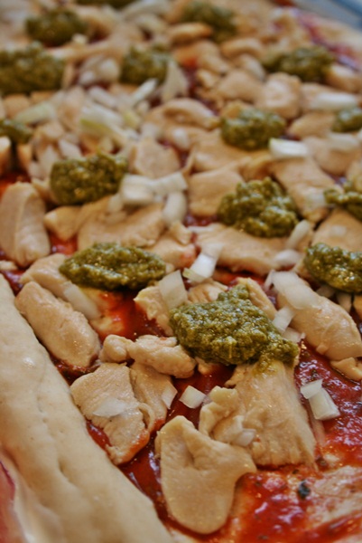 | Den ene halvdelen er det: 1 beger creme fraiche på,spekeskinke i strimler,cerry tomater og løk-den andre delen tomatsaus med urter,kyllingfileter,løk og pesto.Ost strøs på toppen. |