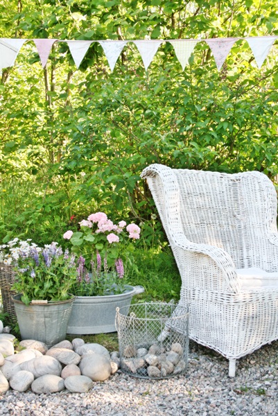 | I et hjørne av hagen har vi valgt å gruslegge et parti,for der grodde gresset så dårlig.Så der har det blitt en herlig sitteplass.Og for å heve stemningen her,lar vi vimlene få vaie i vinden:) |