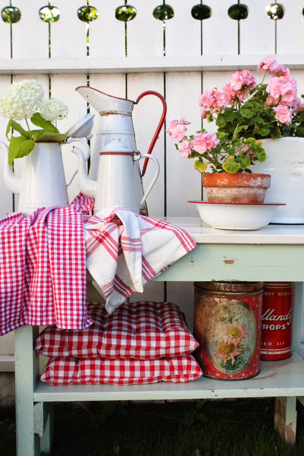 LOVE your enamelware pitchers!! The green table is charming in your garden with the sweet pennants.