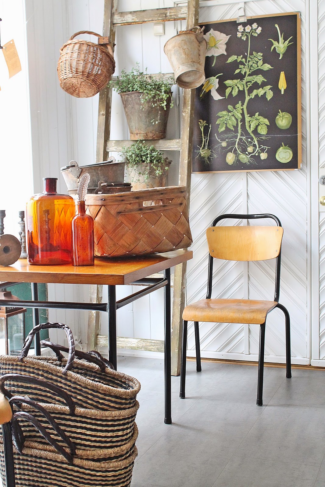 Så tar vi turen ut i butikken, hvor rustikk står i sentrum. Gamle kurver,flasker og plansjer...og den gamle stigen er også til salgs....:)