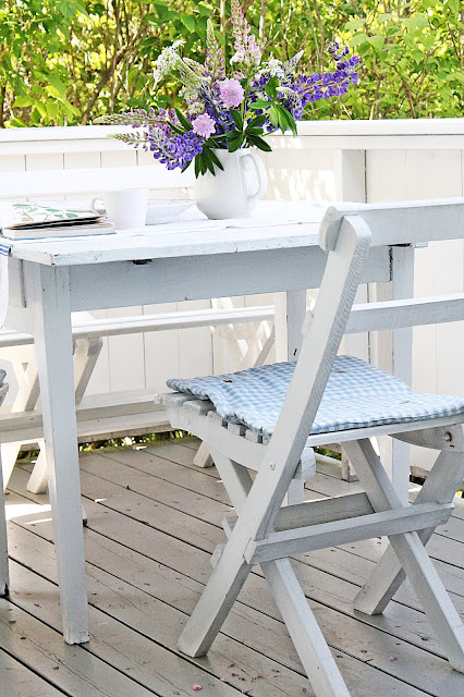 På frokost verandaen vår har jeg gjort om litt med et gammelt bord og benk og stoler av nyere dato. og selvfølgelig MÅ sommerens vakreste blomster sette prikken over i en her :)