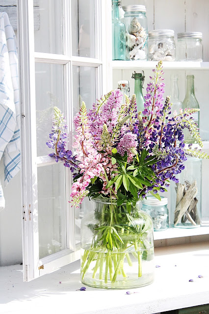 Norgesglassene jeg bruker flittig som dere vet, fylles med sommerens vakre pynt, her skjell fra Danmark.