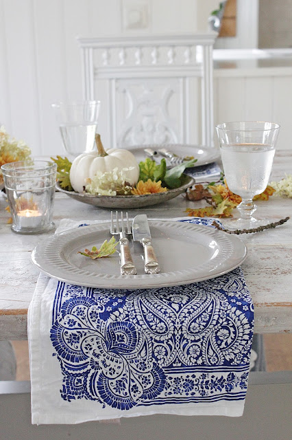 SvarSlettLove the beautiful white pumpkins. Gives such an elegant look to your table with the blue and light gold. Gorgeous!