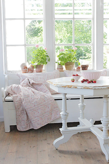 Litt rosa glede i orangeriet også med rosa tekstiler fra Home & Cottage i min nye slagbenk. Bordet skal snart pusses opp og jeg har falt på at det også må milkpaintes :) Jeg tror det blir i en deilig hvit tone.