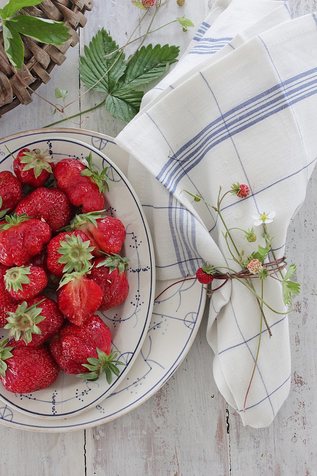 Avslutter innlegget denne gang med nyyyydelige jordbær. Så fantastisk gode og ønsker du å dekke sommerbordet med litt naturmaterialer er det bare ut å plukke markjordbær nå....så veldig søte å pynte servietten med :) Linservietter er fra Home & Cottage og de vakre glassene med syrinsaft er fra GreenGate. Aldri har jeg smakt syrinsaft før og den kan virkelig anbefales og TAKK til Turid som lot meg teste ut den !