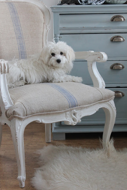Vibeke, the transformation of your chair is marvelous! Those flour sacks woven with their sky blue stripes look so pretty in contrast with the new white paint. The chair is vibrantly fresh! And, sweet little Maja looks darling on the seat. Best wishes for a wonderful week!