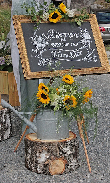 Så skulle endelig det store bondebryllupet i Fjågesund skje...og jeg var både gjest og på bryllupsoppdrag. En calkbord tavle ønsket brudeparet og 150 gjester varmt velkommen med solsikker !