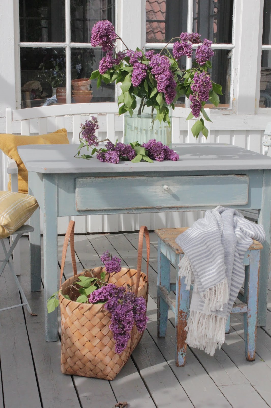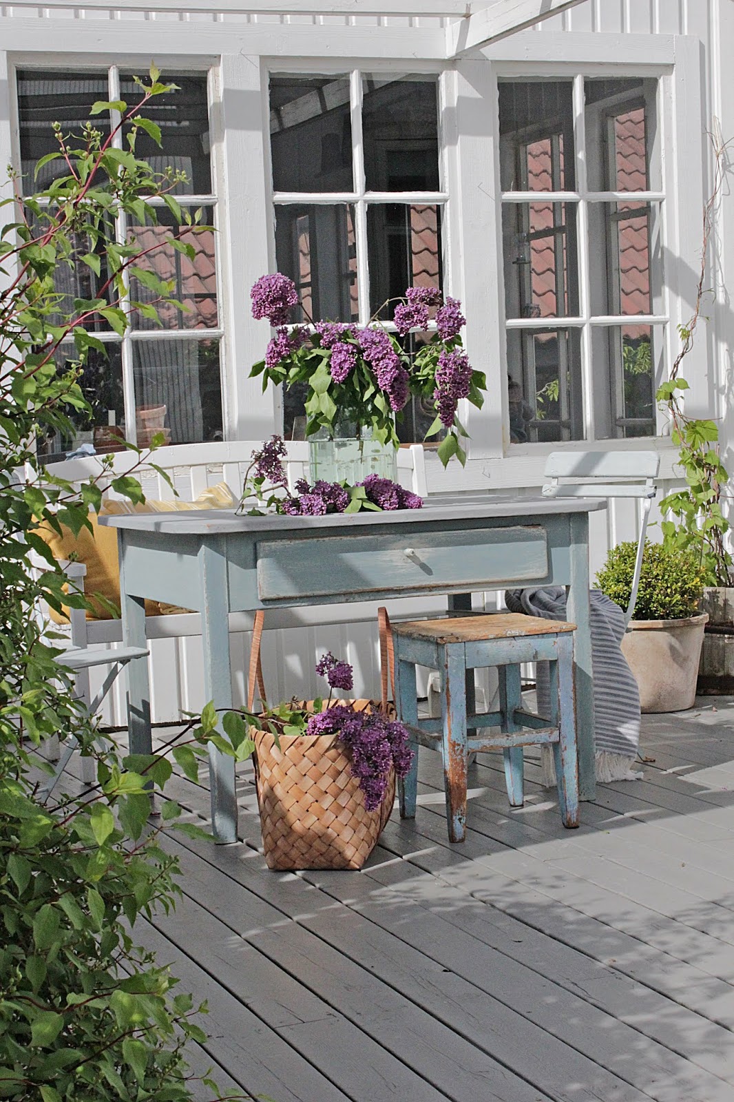 På den lille verandaen foran orangeriet har et gammelt bord jeg har pusset opp med milkpaint tatt plass. Topp plata har fått to strøk med gulvmaling , slik at det skal tåle regn.