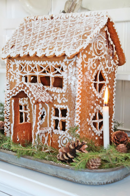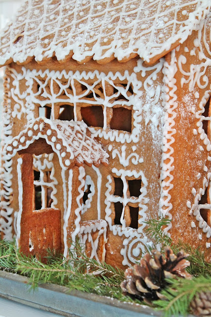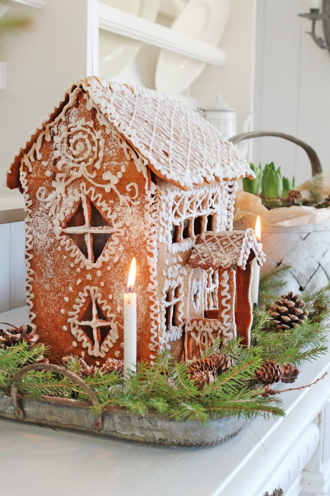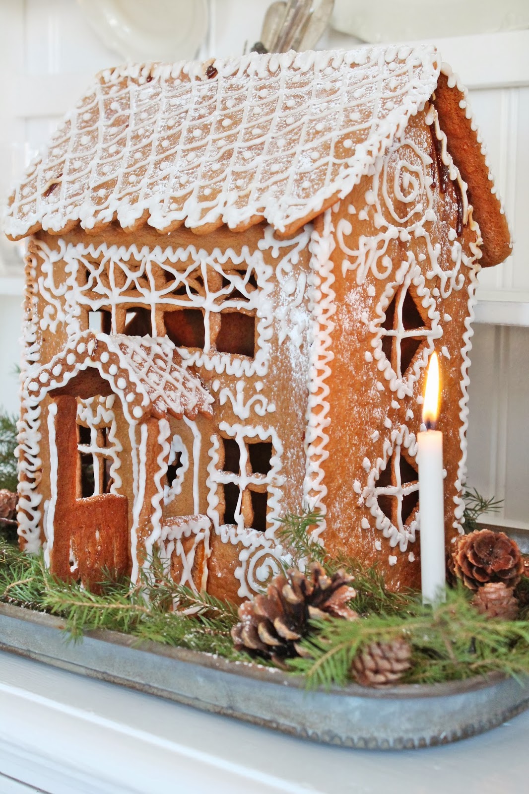 Jeg bruker egghvite i glasuren for å få den stiv . Da blir det lettere å lage mønster på hus og kaker.