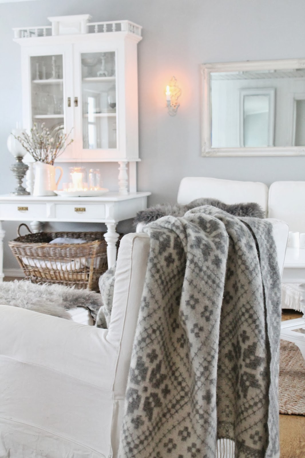 Før jul gikk jeg med store planer om å gjøre noe nytt her i stuen...det skulle tapetseres!! Jeg ville ha noe nytt, og fant tapeten jeg ville ha...MEN så fikk jeg "kalde føtter"og har foreløpig kommet fram til at jeg rett og slett ikke var klar...likevel:) Jeg har vært veldig fornøyd med fargen som heter DUBLIN den har gitt en ro mot den ellers hvite stuen,kanskje den kom enda mere til sin rett etter ny møblering ..? Hvem vet?..Men jeg har nå lagt denne planen på is. Så får vi se hva som skjer......:)