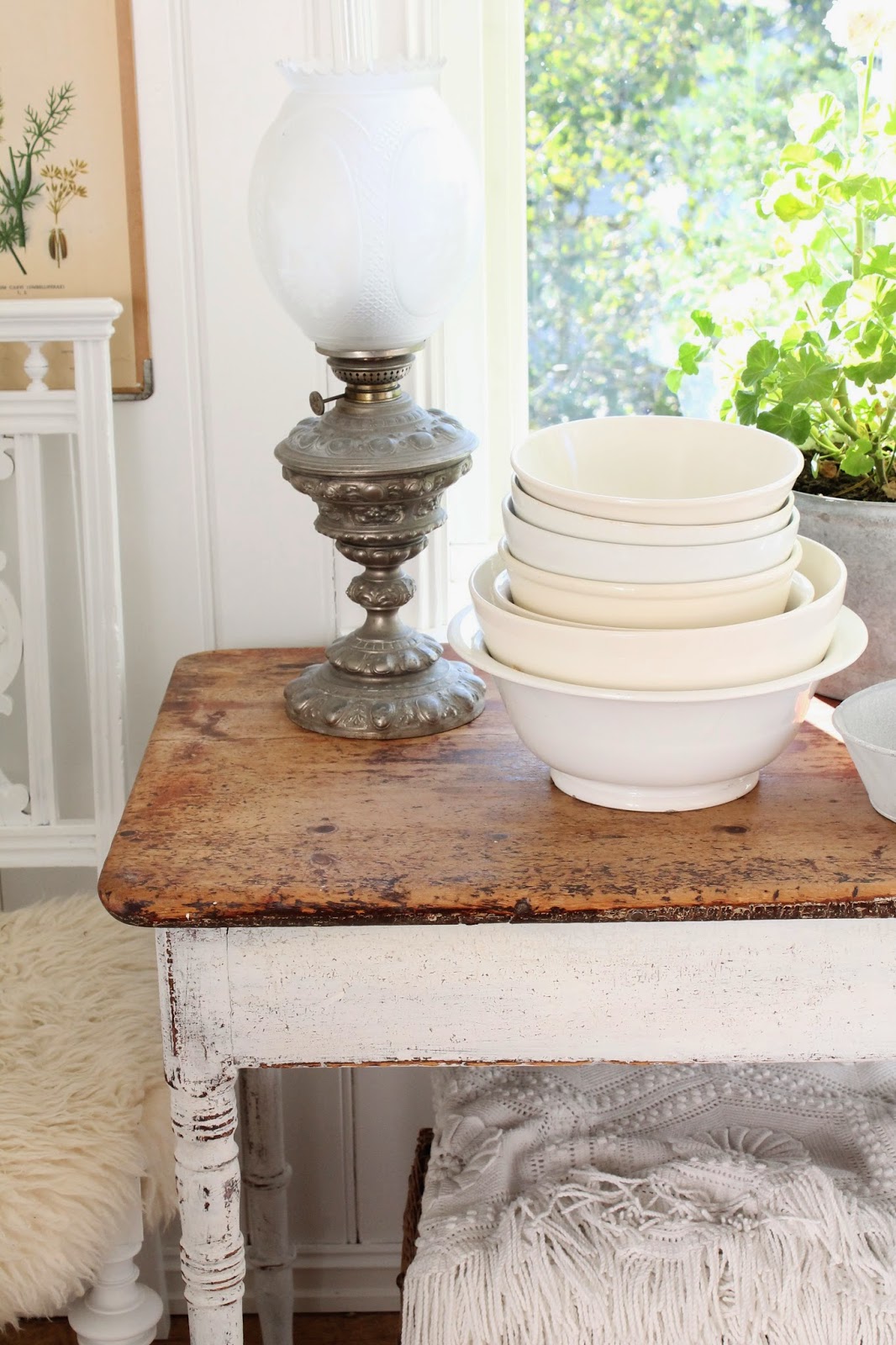 Å JAAAA TAKK flere dager som dette.....:))) En hel dag man kan fylle med det man liker aller best å gjøre ,laaang frokost med familien, jobbe litt hagen, lage god søndagsmiddag, male og pusse på et lite prosjekt med god musikk på øret og sola som varmer i kinna....en luksusdag kaller jeg det :) I dag viser jeg dagens prosjekt, et aldeles sjarmerende gammelt bord som jeg har milkpainted og pusset slitt. Bordplaten er beholdt orginal med sin vakre patina. Understellet var malt brunt og ble litt dystert for min smak. Så derfor valgte jeg å gi det en liten opptur med hvitt :)